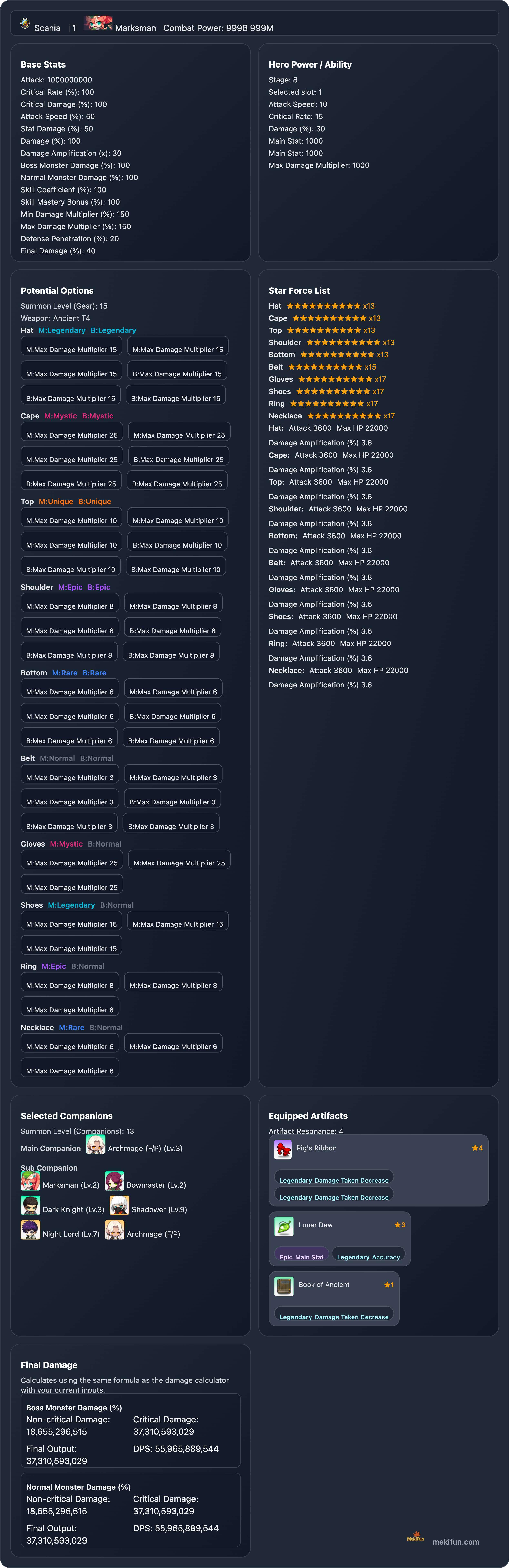 See your World, Class, Combat Power, Potential/Additional, Star Force, Companions/Artifacts, and Damage at a glance.